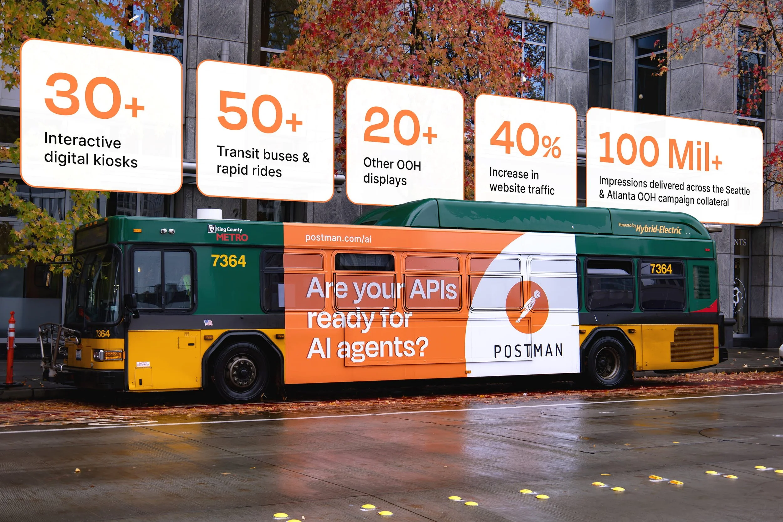 Concept and visual design for Postman’s 2025 “Are your APIs ready for AI?” campaign, a web-led experience encouraging teams to strengthen API foundations before scaling AI. The campaign extended into Postman’s first multi-city OOH rollout across San Francisco, New York, Atlanta, and Seattle, generating 100M+ impressions and driving measurable lifts in brand awareness, web traffic, and conversions.