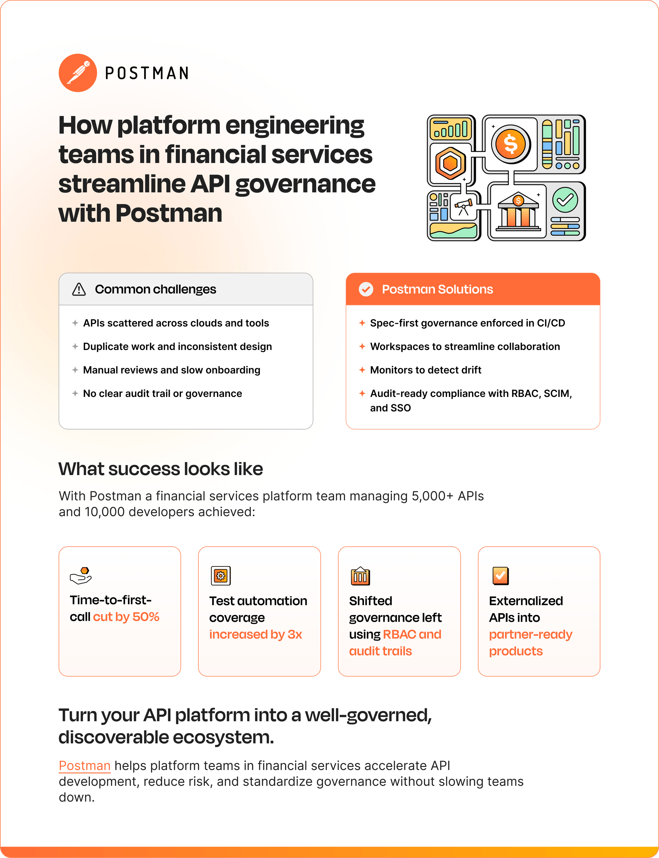 Visuals for the initiative display branded illustrations and PDF assets that highlight how companies across industries scale their APIs with Postman, emphasizing clarity, storytelling, and a consistent visual language.