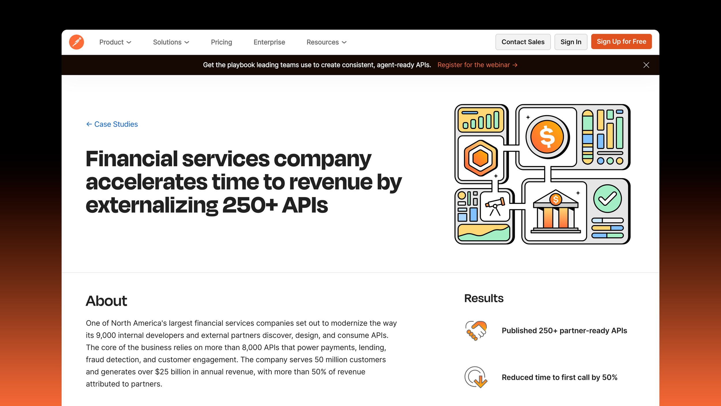 To celebrate our customers, each case study features custom artwork in Postman’s signature brand style, showcasing the customer’s logo alongside an illustration that highlights the service they provide. This approach has sparked genuine enthusiasm and appreciation, with customers excited to receive and share their own bespoke illustration.