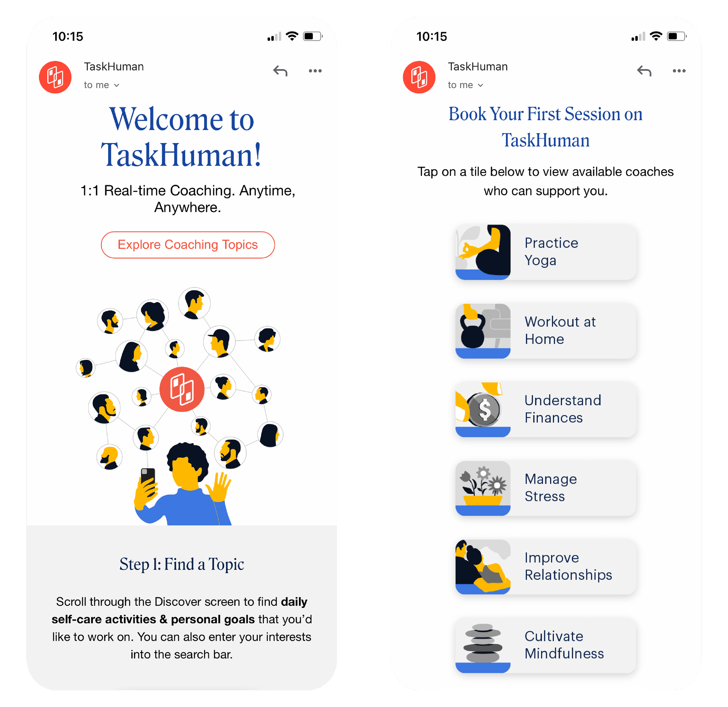 TaskHuman is a mobile platform that connects users with live wellness coaches for one-on-one video sessions.