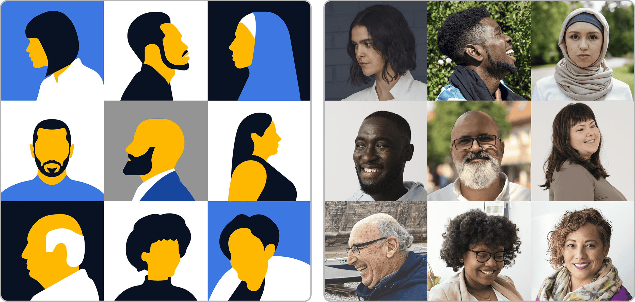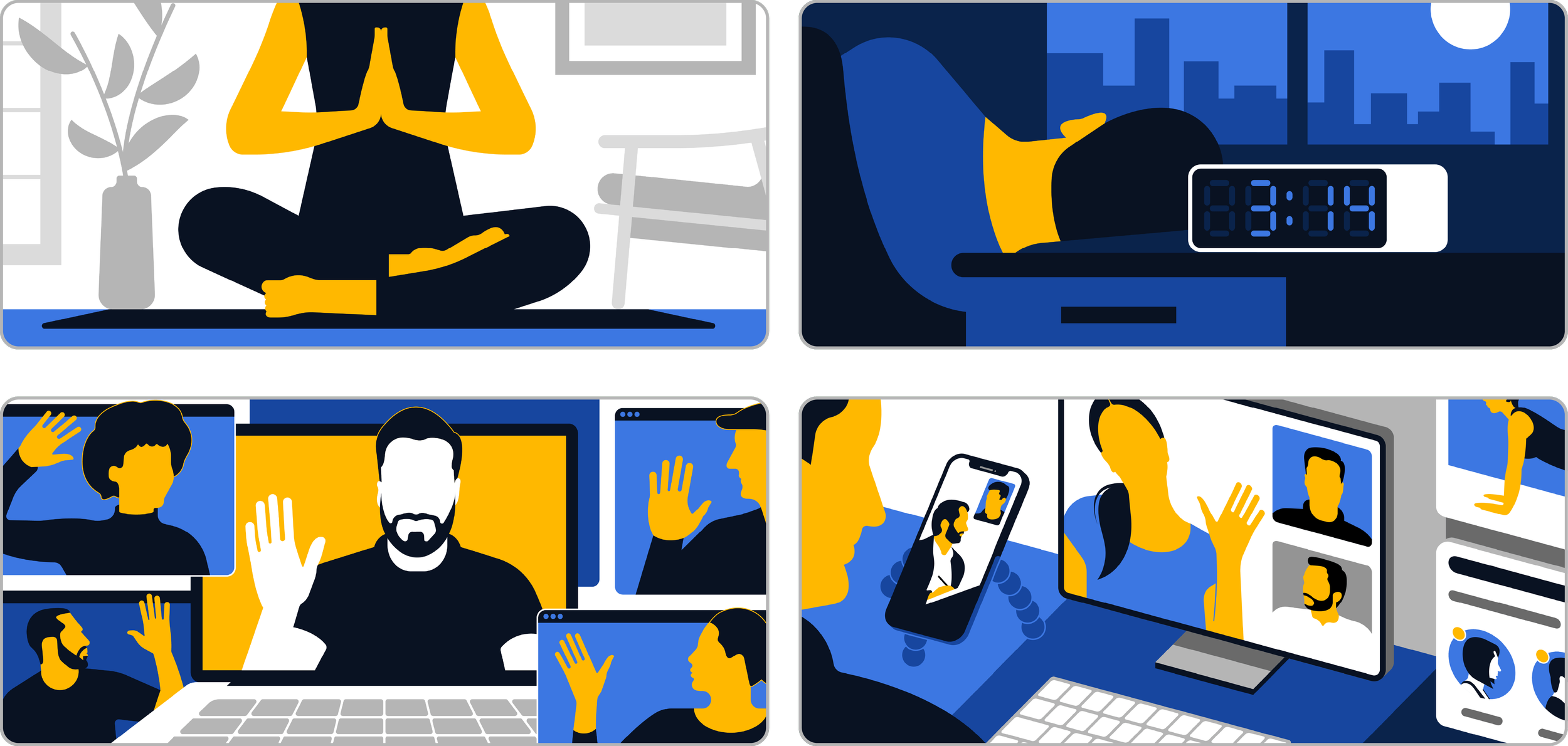 An illustration system was developed to establish an inclusive visual style that celebrates diversity through a balance of organic and geometric forms. The approach draws on the new color system, which pairs yellow with shades of blue and gray to create a strong, cohesive focal point.