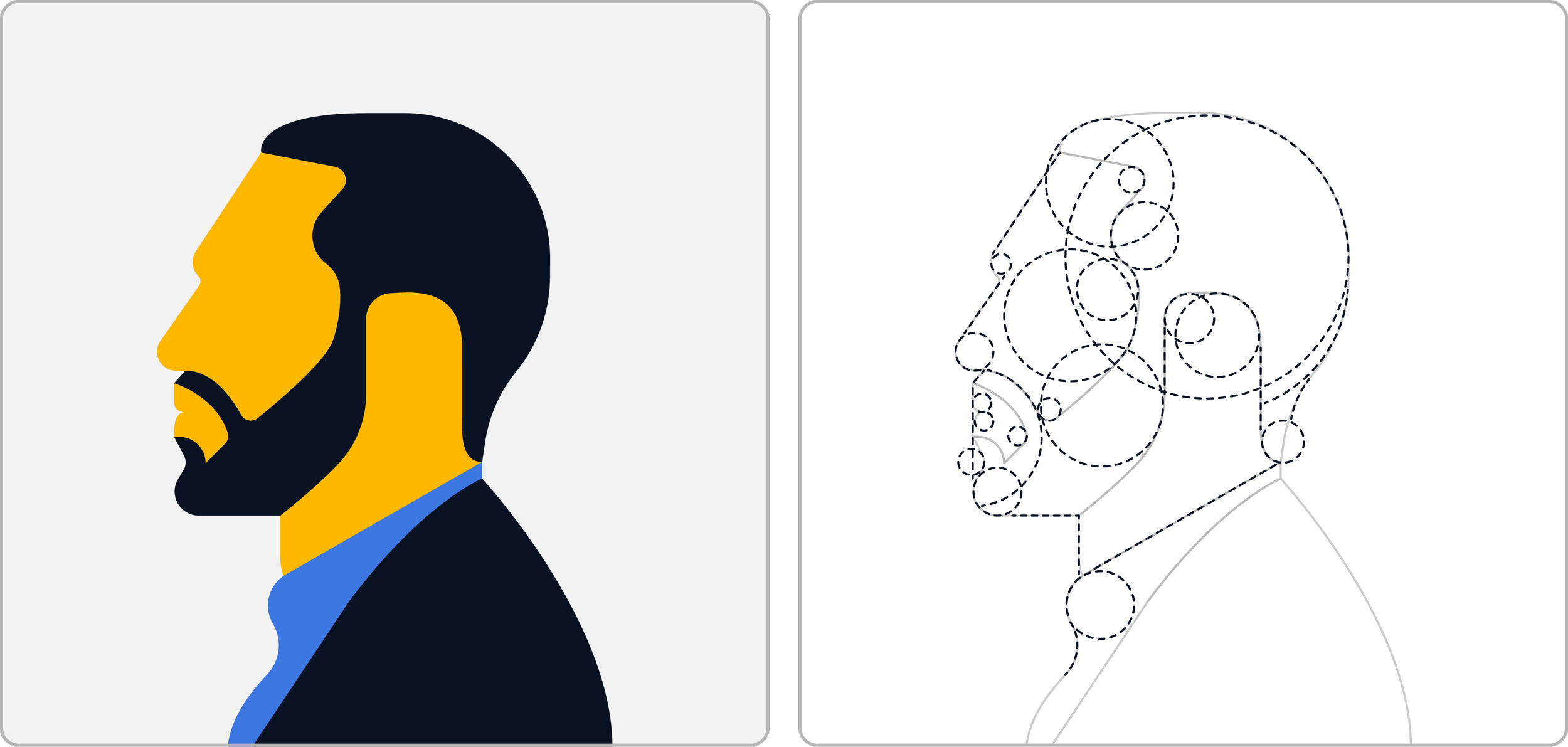 Geometric shapes help add visual interest without relying on adding details. This helps simplify the form and figure. The usage of ellipses, straight lines, and bezier curves achieve this aesthetic throughout the illustration system.
