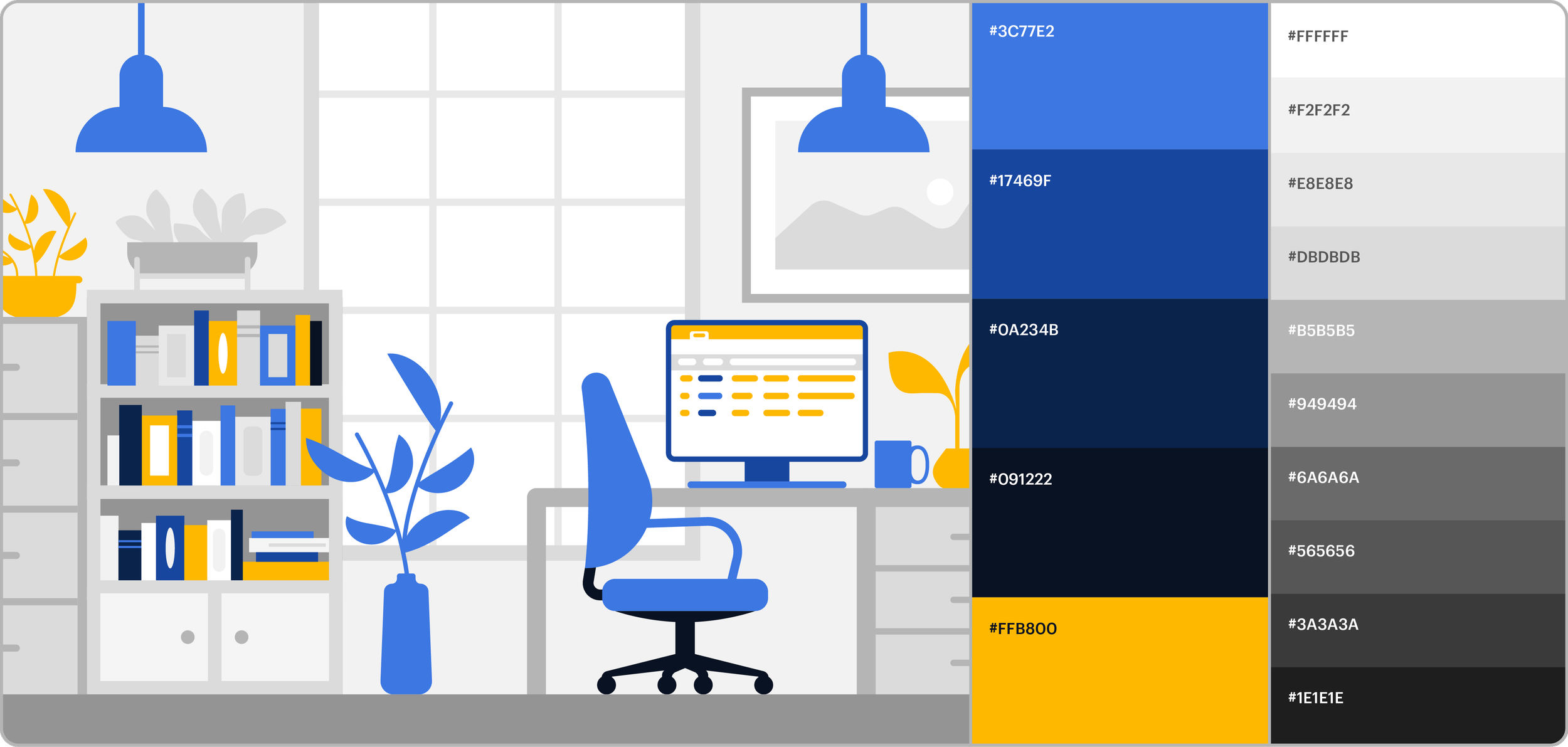 The illustration color system follows a limited palette to maintain consistency and produce branded assets. Values of blue, yellow, and neutrals form the palette. Pairing of our primary colors adds playfulness and draws focus to certain details.